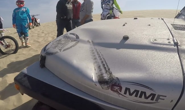 Unos chicos estaban grabando sus asombrosas acrobacias en motocicletas, en las dunas del desierto de Qatar, cuando de repente, a uno de ellos no le salió el truco como esperaba y golpeó una Jeep Wrangler con su rueda trasera.