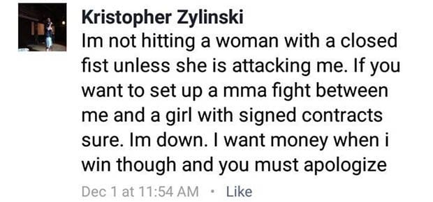 Kristopher Zylinski decidió convertirse en un idiota en las redes sociales con tremendas afirmaciones, diciendo que ni siquiera una mujer entrenada en artes marciales sería capaz de vencerlo en una pelea.