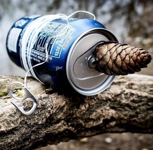 Convierte una lata de refresco en una caña de pescar improvisada quitando la lengüeta y convirtiéndola en un gancho. Toma un trozo de hilo dental o una cuerda y átala alrededor del exterior y pon algo en la boca de la lata para evitar que se hunda.