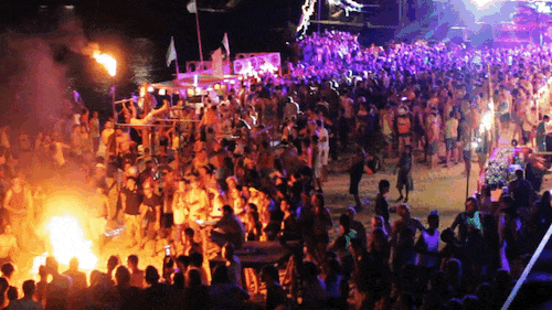 La música es variada, desde el R&B, el trance, house y reggae, entre otros, mientras que abunda el alcohol. Hay un frenesí de bailes, espectáculos de fuego, y nada menos que toda la locura local y turística. Las linternas coloridas encienden los alrededores y el arte está presente en todas partes.