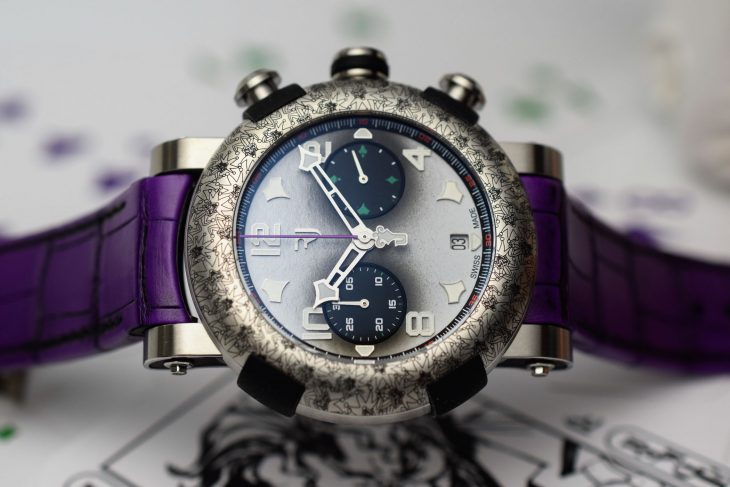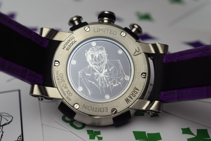 Este cronógrafo de 4.5 centímetros de diámetro fue hecho con titanio cepillado y satinado, agujas con forma de corazón y un cristal de zafiro antireflejante. Los detalles del reloj son pintados a mano, así que no hay dos Arraw The Joker que sean iguales.
