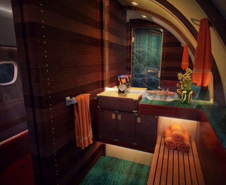 El Skyacht One, diseñado por SottoDesign Studio, se aventura a crear una fusión entre un jet privado Lineage 1000E Embrarer con un yate de súper lujo. Tiene cinco cabinas, una sala de conferencias, área de comedor y una master suite con los más finos acabados entre caoba y bronce.