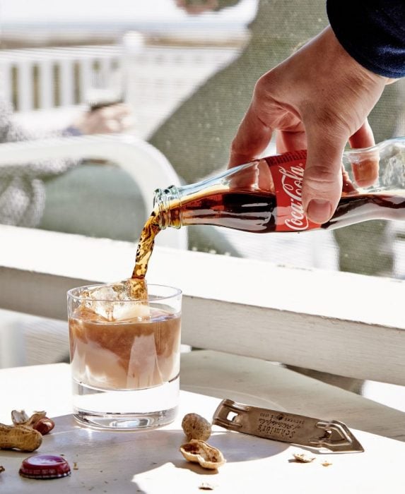 Muy sencillo de hacer. Sirve el whisky en un vaso y le agregas unos cacahuates. Lo remueves y añades un toque de refresco de cola.