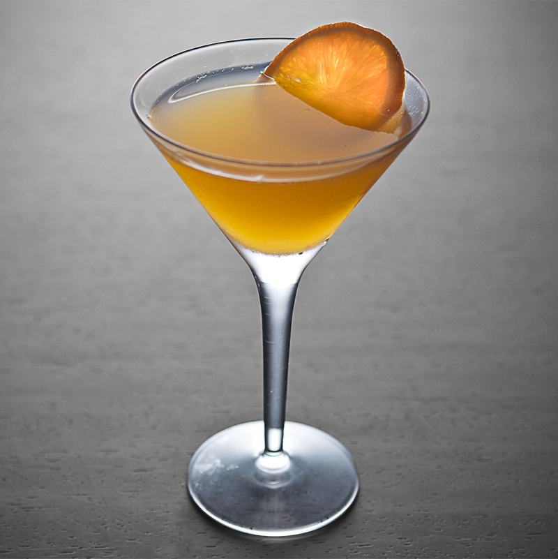 Añadir todos los ingredientes, excepto el adorno de naranja, a un vaso de mezcla. Llenar con hielo y agitar hasta que se enfríe. Cuele en una copa de coctel. Torcer la piel de la naranja sobre el cristal para dejar salir su jugo y desechar.