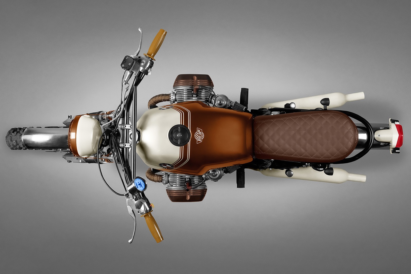 Para dar un giro a la R45 destrozando el estilo pueril y llegar al “Pure”, Ton-Up modificaron algunos elementos y puso sus propios asientos personalizados y su estructura de apoyo, un velocímetro cromado, luces de direccionales de aluminio, una luz trasera de English Lucas, defensas off-road y, por supuesto, lo más atractivo visuaslmente: sus neumáticos all-terrain Knobby.