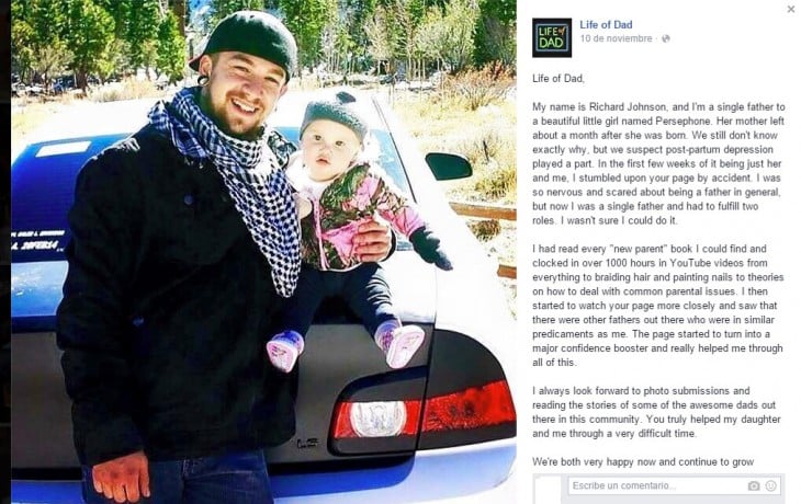“Mi nombre es Richard Johnson y soy el padre soltero de una preciosa niña llamada Persephone. Su madre nos abandonó un mes después de su nacimiento. Aún no sabemos muy bien por qué, pero sospechamos que la depresión posparto jugó un papel importante. En las primeras semanas en que me encargaba solo de ella, me tropecé con esta página por accidente. Estaba tan nervioso y asustado por su llegada al mundo y por tener que cumplir el rol de padre y madre que no estaba seguro poder lograr.