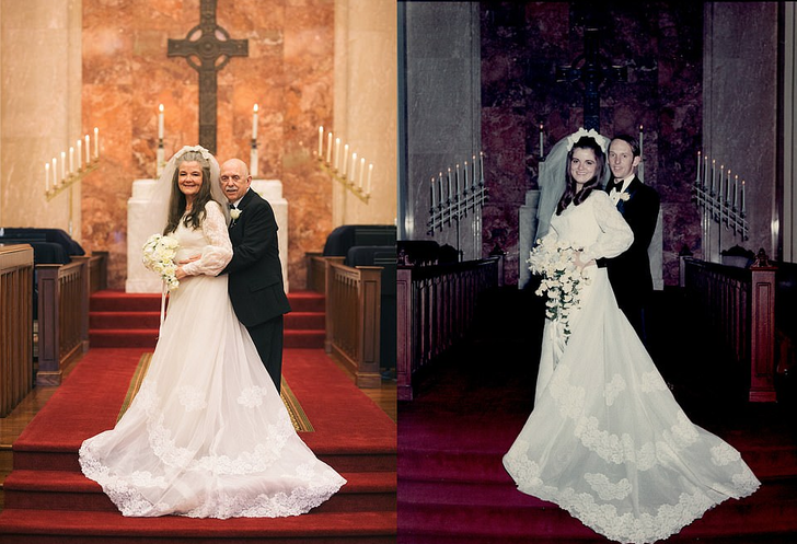 Luego de 50 años, la pareja regresó a la misma iglesia en Des Moines, Iowa, adoptaron las mismas poses que en 1971 e, incluso, Carolyn utilizó el mismo vestido con el que se casó. Sin embargo, Kelly sí tuvo que comprar un traje nuevo, pero idéntico al que usó en su boda. Además, la iglesia fue modificada y le devolvieron el mismo color que tenía en los 70, así que todo estaba dispuesto para que el fotógrafo Sam Hoyle hiciera su trabajo.
