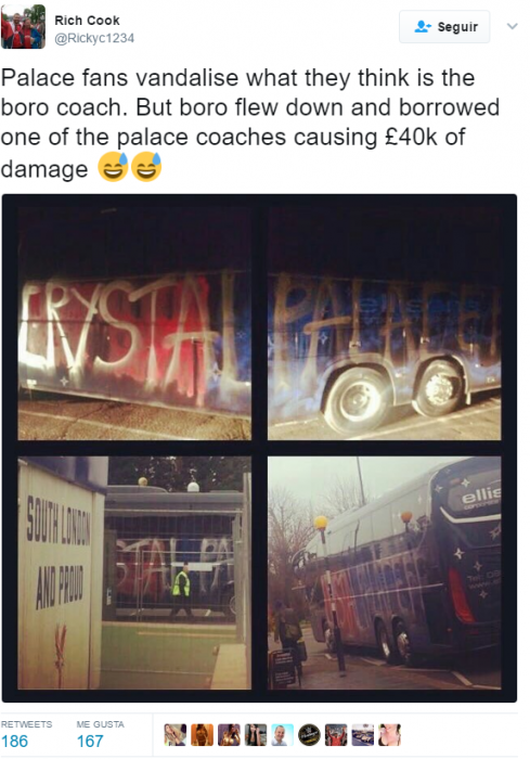 Varios aficionados al futbol, del sur de Londres. desfiguraron el autobús oficial de su equipo favorito Crystal Palace, después de creer que pertenecía a sus rivales de Middlesbrough.