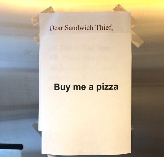 “Querido ladrón del sándwich. Hola, es Tina de Recursos Humanos. Por favor regresa el sandwich y no investigaremos esto más a fondo”