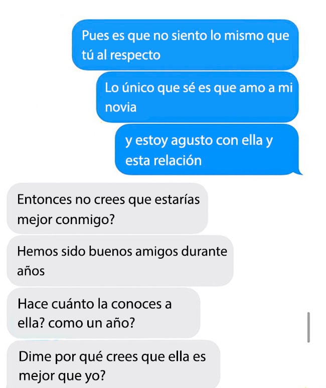 El día de hoy les pondré un claro ejemplo con una conversación entre dos personas, un hombre y una mujer. Él está muy feliz en una relación estable con su novia de hace poco más de un año; ella quiere salir con él, a pesar de que sabe que se encuentra de novio con alguien más.