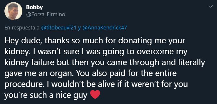 “Oye, amigo, muchas gracias por donarme tu riñón. No estaba seguro de superar mi fallo renal, pero llegaste y literalmente me diste tu órgano. Además, pagaste por la operación. No estaría vivo de no ser por ti, eres un gran tipo”.