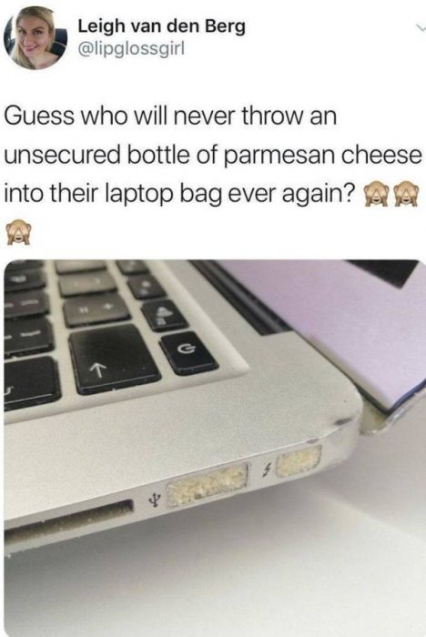Adivinen quién no arrojará nunca más una botella insegura de queso parmesano a la mochila de la laptop.