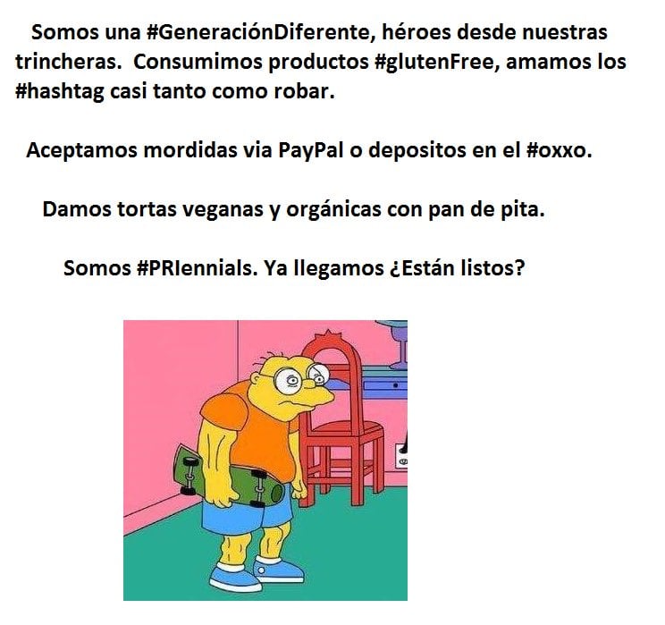 El 9 de octubre subió a las redes sociales una imagen de un joven con barba y lentes mirando el amanecer (¿o el atardecer?) político. En la imagen se lee “Somos una #GeneraciónDiferente, héroes desde nuestras trincheras. Nosotros no seguimos intereses, nos mueven las causas. No somos el nuevo PRI. Somos #PRIennials. Ya llegamos ¿Están listos?”