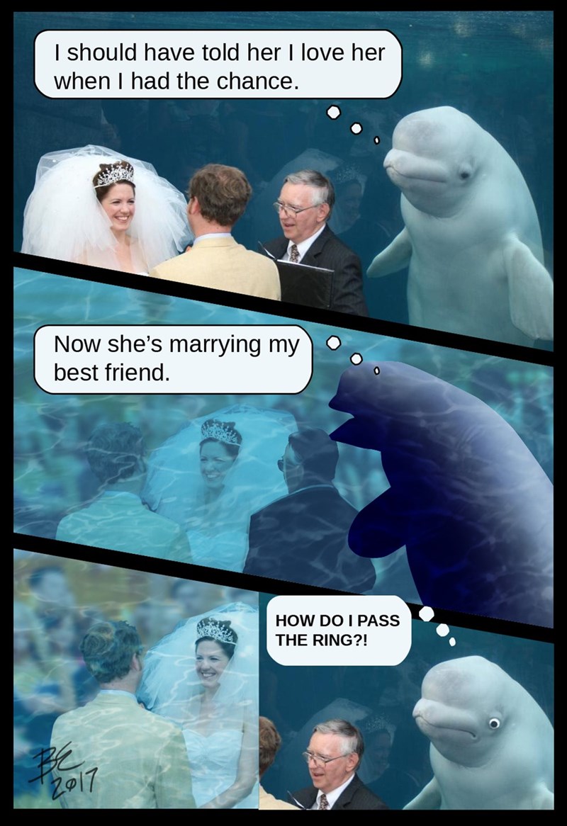 Una pareja de enamorados tuvo la romántica idea de casarse en un acuario, enfrente del tanque de la ballena beluga. Seguramente creyeron que sus fotos serían innolvidables, y lo fueron, sobre todo porque la ballena decidió tomar parte en la ceremonia. Eso fue suficiente para que se volviera la siguiente batalla de Photoshop. Esta es la imagen original: