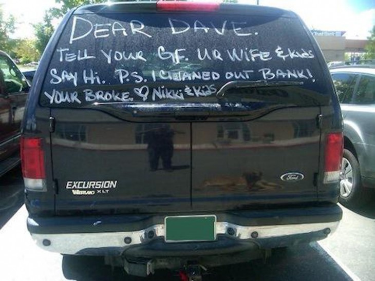 “Querido Dave: dile a tu novia que tus hijos y tu esposa le mandan saludos. PD: Vacié las cuentas del banco ¡Estás en quiebra! Nikki y los niños”.