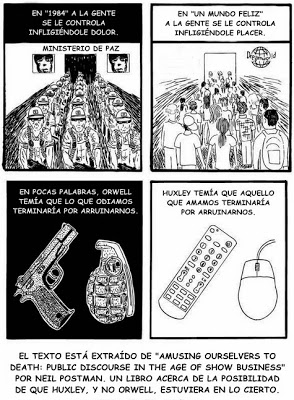 Cuando Donald Trump asumió la presidencia de los Estados Unidos, el libro de ficción de George Orwell, 1984, se convirtió nuevamente en un bestseller, y aunque muestra una sociedad distópica, peligro para los que se encuentran bajo el liderazgo de Trump, un caricaturista nos recuerda que estamos más cerca del futuro no menos terrible de Un Mundo Feliz, de Aldo Huxley.