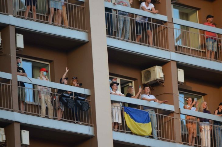 La banda de rock O.Torvald se instaló en el tejado de un edificio frente a los balcones del Hotel Bratislava en la ciudad de Kiev. Sus admiradores rentaron habitaciones por una noche y salieron a los balcones para disfrutar la música en vivo.