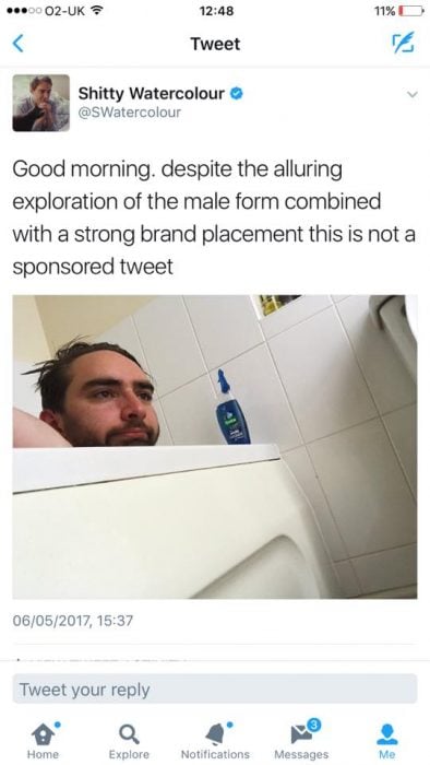 “Buenos días, a pesar de la seductora exploración de la forma masculina combinada con el posicionamiento de una marca comercial, esto no es un tuit patrocinado”.