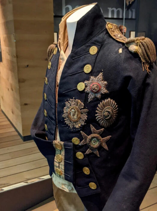 Horatio Nelson fue un vicealmirante de la Marina Real británica del siglo XVIII. Durante la batalla de Trafalgar, en 1805, el naval fue alcanzado por un tirador, quien le disparó a distancia. La bala atravesó su cuerpo dañando la columna vertebral, lo que marcó la muerte de Nelson. El saco, en el que se ve el orificio de la bala, está expuesto en el Museo Marítimo Nacional de Londres.