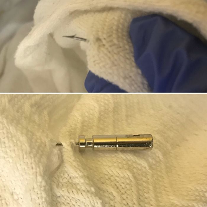 Es la señal de que quien la usaba fue atacado con una pistola Taser, un inmovilizador eléctrico, y este es su dardo.