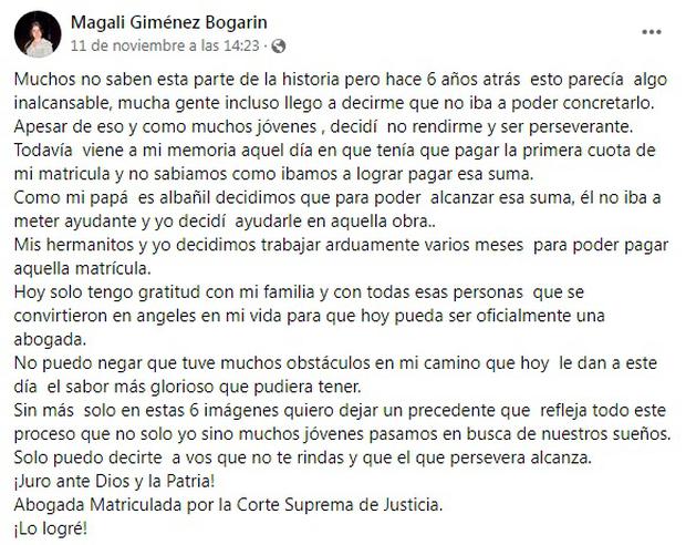 Magali Giménez Bogarín tiene 24 años y aunque ingresar a la universidad parecía algo que no podría hacer por su precaria economía, además de que las oportunidades laborales para ella en su natal Paraguay eran muy pocas, logró graduarse como abogada.