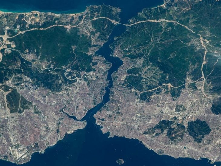 Jeff Williams tomó esta foto de la ciudad de Estambul, desde la Estación Espacial Internacional. Antes Constantinopla, es el centro histórico, cultural y económico de Turquía; fue capital de Estados soberanos como el Imperio romano de Oriente o el Imperio latino. El Bósforo, conocido como estrecho de Estambul, separa Europa de Asia. Muchas naciones durante miles de años se han peleado el control del mismo.