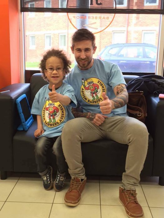 Se llama “Ensamble de Barberos por el Autismo”, y la premisa básica es que James y otros colegas viajen por todo Reino Unido para hacerles cortes de pelo a niños autistas. El grupo tambien tiene calcomanías para peluqueros y estilistas (y las ganancias van a la caridad) para motrar que son establecimientos que cortan el pelo a autistas.