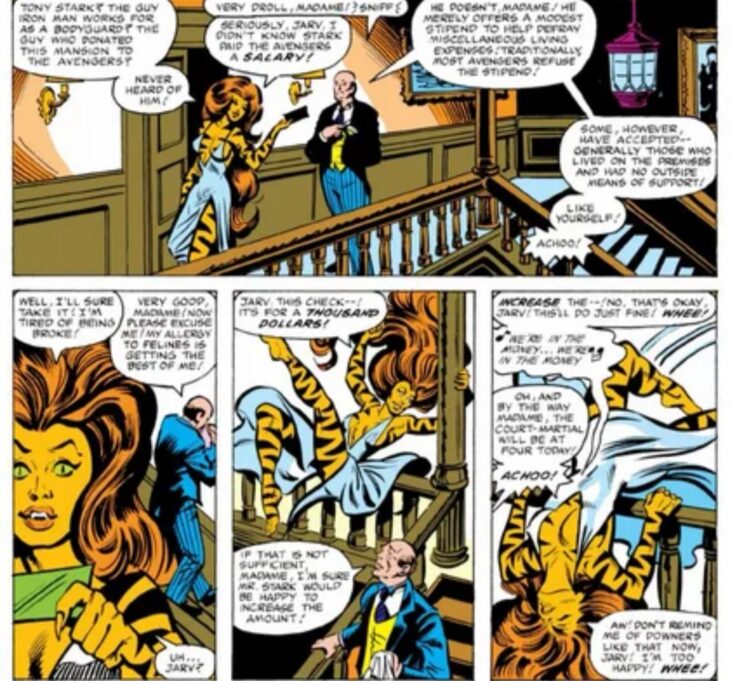 En el número 213 del cómic de Avengers, Tigra sostiene una charla con Jarvis, mayordomo de Tony Stark, quien le dice que los miembros activos del equipo de héroes tienen un salario de 1000 dólares a la semana y a aquellos que solo participaban esporádicamente se les daba un cheque por 100 dólares cada mes. Trasladando estas cifras de los 80 a la actualidad, equivaldría a unos 2185 dólares por semana y 281 para quienes reciben el pago mensual.