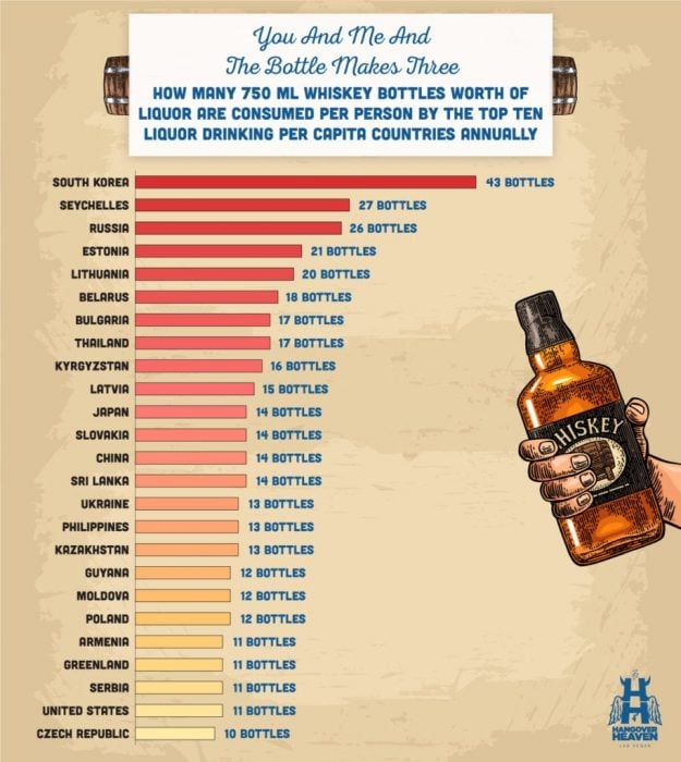 En cuanto al consumo por botella, en Corea del Sur una persona se llega a beber 43 botellas de whiskey cada año -la bebida favorita-, pero dependiendo de la región y, el gusto, pueden ser botellas de vodka, tequila, ginebra, entre otros.