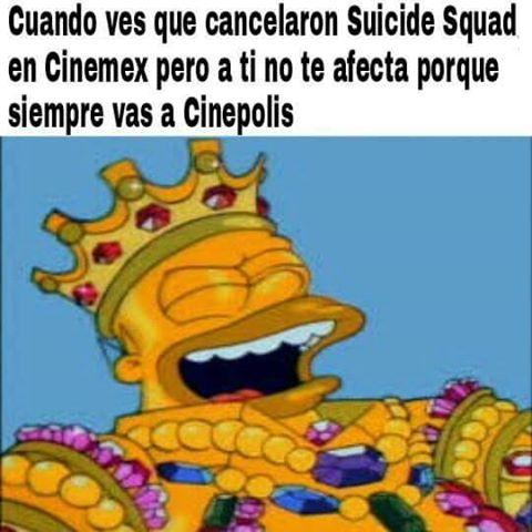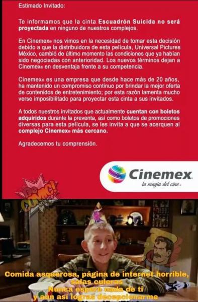 Debido a supuestos problemas con la distribuidora Universal Pictures, que difunde el sello Warner, la cadena Cinemex canceló el estreno de Suicide Squad en sus salas, lo que llenó de enojo, tristeza, desconcierto y por supuesto, mucha creatividad, a quienes esperaban con ansias ver esta película, ya que ante el anuncio, comenzó a circular una buena cantidad de memes, todos super divertidos.