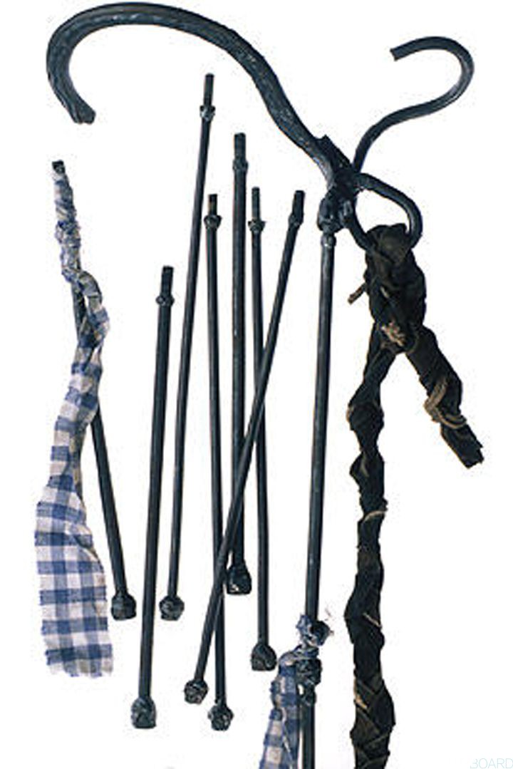 Hecho con varilla segmentada para una extensión total de 4.5 metros (13 segmentos totales); cuerda de cuero y cadena. Esta herramienta inteligentemente concebida asistió a dos reclusos en su fuga de la prisión de Ludwigsburg, Alemania, el 19 de agosto de 1987. La barra adjunta les permitió colocar y recuperar el gancho y así saltar dos muros de la prisión.