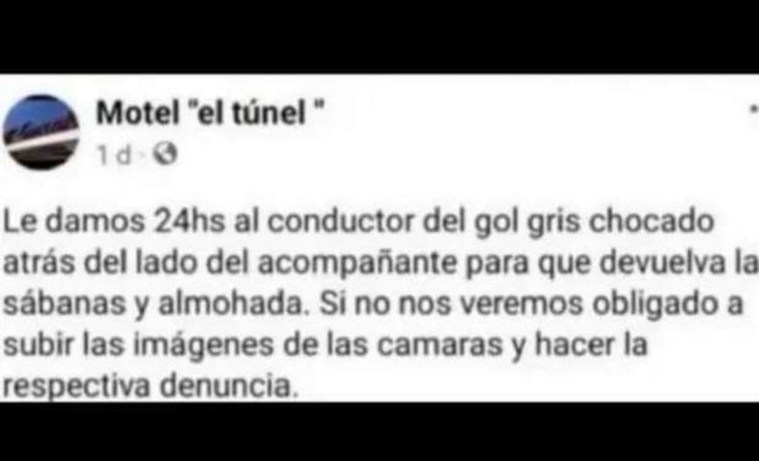 A través de Facebook, se hizo viral la amenaza del Motel El Túnel, ubicado en Frontera, Argentina, de exponer a aquellos huéspedes que se llevaron las sábanas de la cama que utilizaron. La gerencia del lugar les pidió que las devuelvan, de lo contrario, compartirán el video del robo. Ojalá que cuando las regresen, las lleven lavadas…