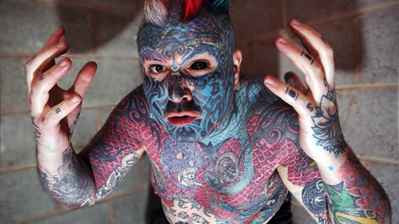 Más del 90 por ciento de su cuerpo está cubierto con más de 300 tatuajes, incluyendo el blanco de sus ojos, que fueron teñidos de negro.