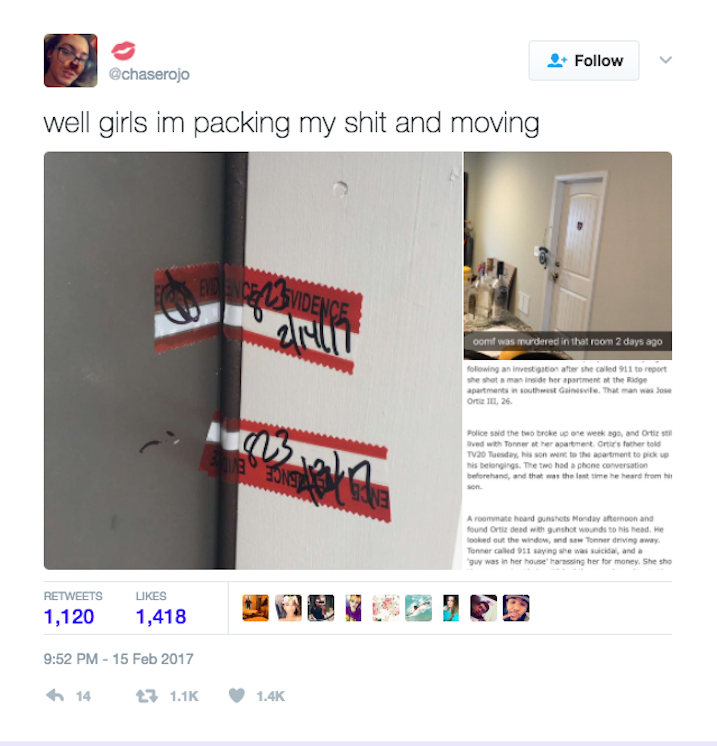 Eso le pasó a un chico de Gainesville, Florida, quien descubrió que su roomate mató, en el departamento de ambos, a su novio, y al no saber qué hacer tuiteó, cual reportero profesional, todo lo ocurrido en tiempo real, mientras iba descubriendo. Su compañera, Katherine Jean Tonner, de 24 años, fue detenida y llevada a la cárcel del condado Alachua por matar a su novio, Jose Ricardo Ortiz III.