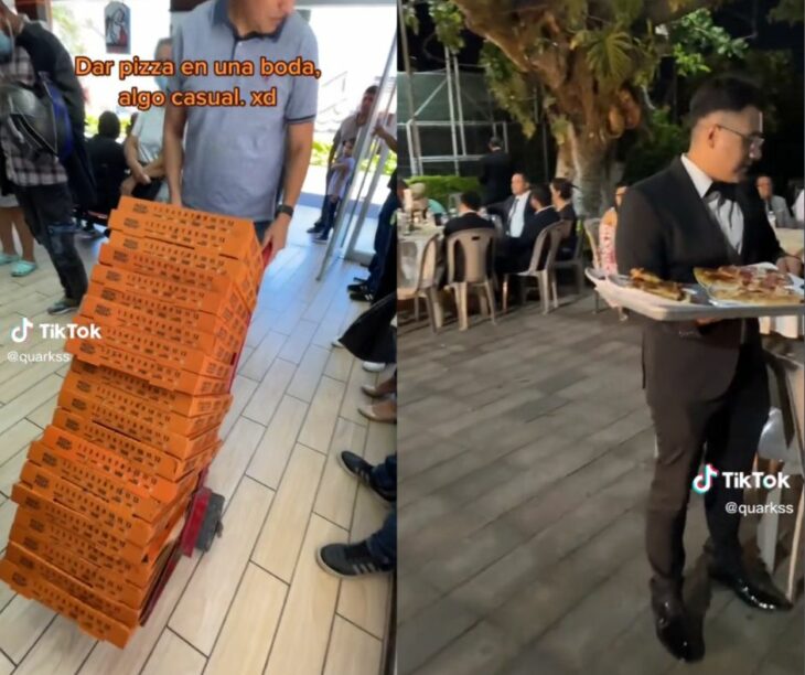 Según el usuario @quarkss, compraron 68 cajas en total para calmar el hambre de los guapos asistentes. Lo que no está claro es si los novios ofrecieron algo más para comer, pues en cada plato se observan solamente tres rebanadas de pizza, ni una más ni una menos.
