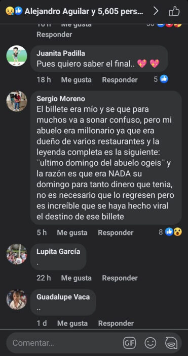 En los comentarios, muchos han dejado su puntito para que la publicación destaque en el timeline de sus contactos. Otros compartieron su propias historias donde han conservado billetes que han sido marcados por frases de sus antiguos dueños. Incluso han salido los “chistosos” a decir que el billete es de ellos acompañado de “completar” el nombre del abuelo.