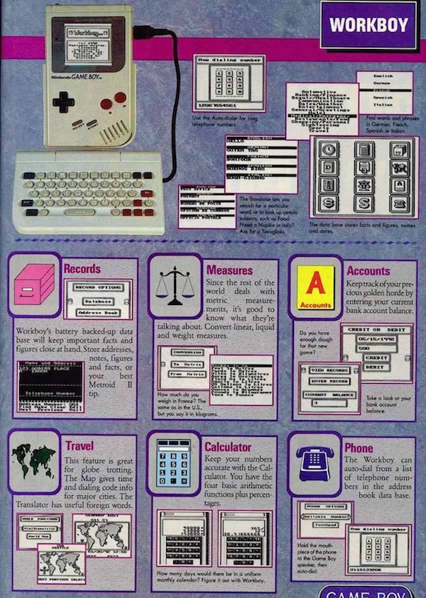 Ahora en tu celular tienes a la mano muchas aplicaciones para la vida cotidiana, pero en 1990 el Game Boy iba a ser el primer dispositivo móvil multifunción. La compañía Fabtek planeaba lanzar el dispositivo periférico Work Boy que iba a convertir la videoconsola en un asistente digital con llamadas de teléfono, calculadora, procesador de archivos y hasta GPS.