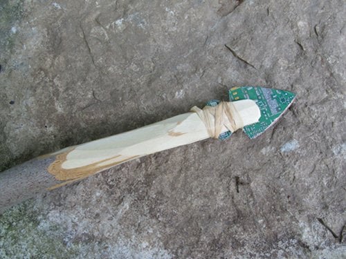 La otra mitad se puede utliar para haer una punta de flecha, amarrada a una vara con las cuerdas naturales encontradas. La punta puede ser usada para defensa personal o para buscar comida. También se puede hacer una punta de flecha con un pedazo de metal doblado.