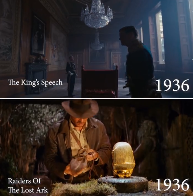 El discurso del rey presenta el momento en que Inglaterra se prepara a entrar a la Segunda Guerra Mundial, pero el rey en turno abdica, por lo que Jorge VI tiene que tomar el poder a pesar de su tartamudez. Mientras tanto, Indiana Jones competía en una carrera contras Hitler por encontrar las tablas de los diez mandamientos.
