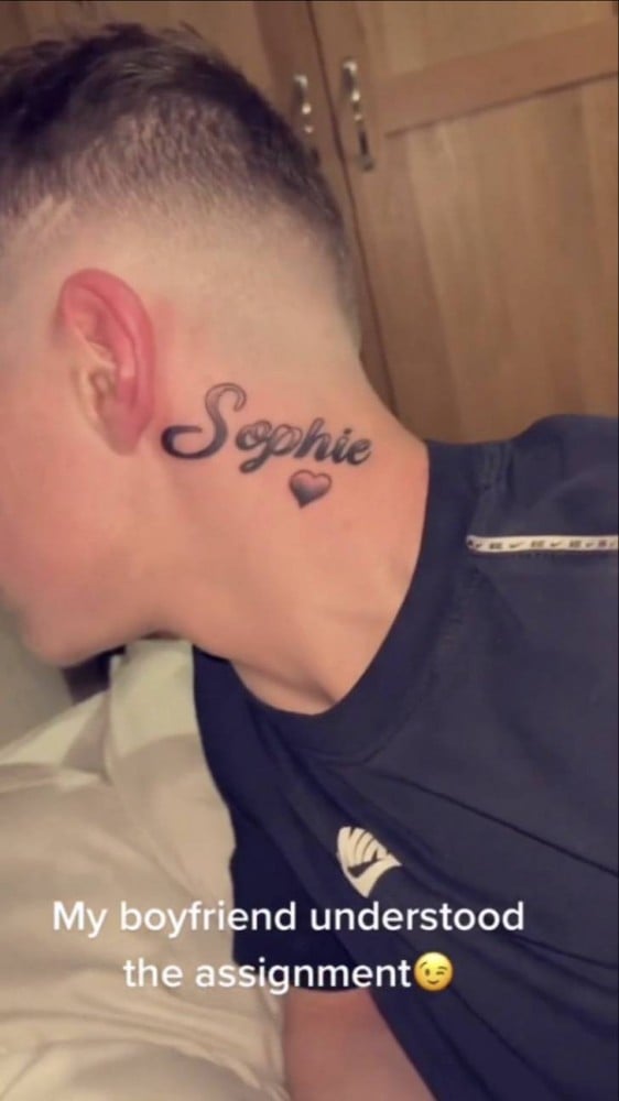 En este caso, un joven se puso el nombre de su amada en el cuello porque, al parecer, tenía una garantía: ella le dijo que no se van a separar nunca… Con un corazón y de buen tamaño, ahora luce un “Sophie” en el cuello, pero a través de TikTok ya son cientos los que le han dicho que se va a arrepentir, pues su novia se irá en algún momento.